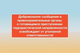 Противодействие терроризму — задача не только спецслужб, но и каждого гражданина. В соответствии с законодательством Российской Федерации, лицо, участвовавшее в подготовке или совершении преступления террористической направленности, освобождается от уголовной ответственности, если оно добровольно и своевременно сообщило о готовящемся преступлении правоохранительным органам, а также способствовало его предотвращению.