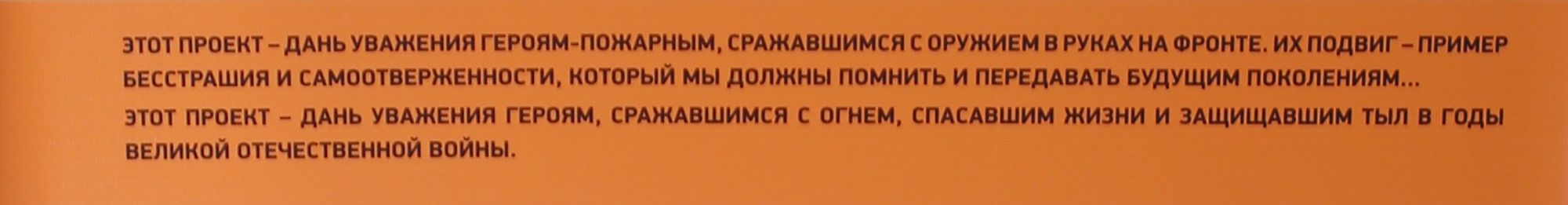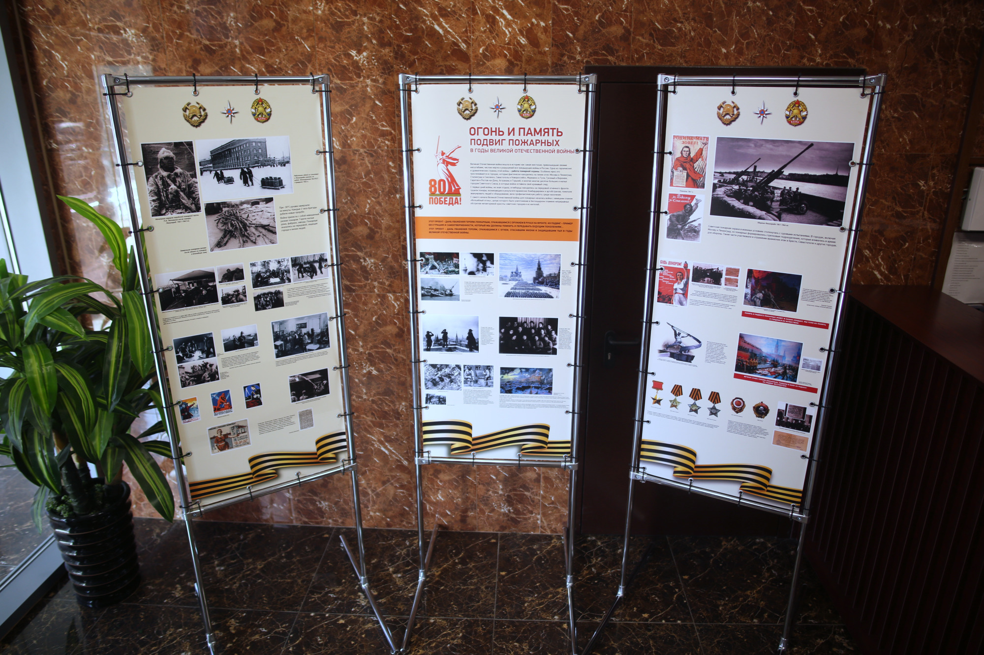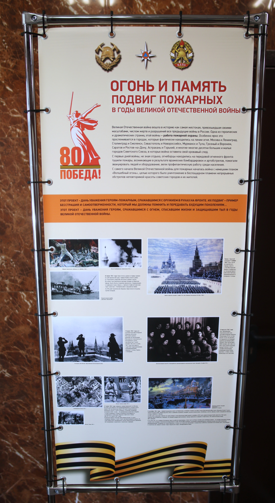 Теперь в холле учреждения все работники могут увидеть красочные, информационные стенды, повествующие о безграничном героизме пожарных в период Великой Отечественной войны. Москва, Ленинград – здесь самоотверженный труд пожарных, как мужчин так и женщин разного возраста остался особенно заметным в исторической хронике. Поэтому большинство фотоматериалов и информации на стендах повествуют о событиях произошедших в этих городах.
