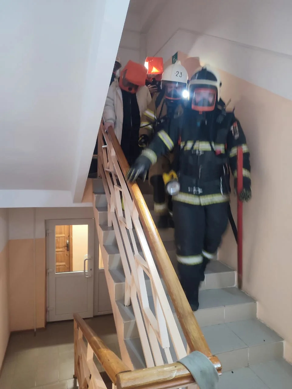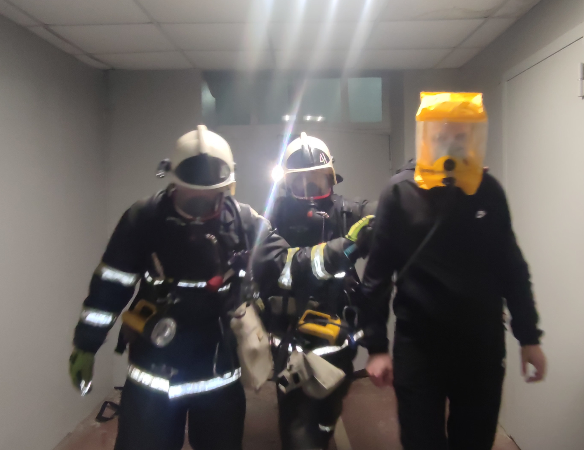 В это же время в Долинском районе работники пожарно-спасательной службы проводили ПТЗ на территории общежития Строительного техникума. В ходе тренировки из здания было эвакуировано 49 человек. Во время разведки также были найдены «потерявшиеся» студенты. Огнеборцы надели на молодых людей средства индивидуальной защиты органов дыхания и зрения и вывели через задымлённые участки здания в безопасное место.