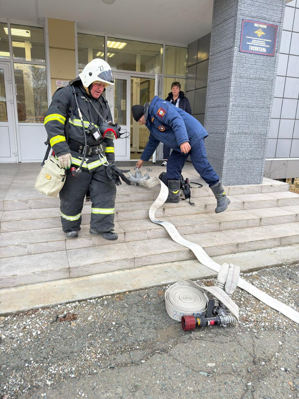 24 ноября в здании госпиталя МСЧ МВД России по Сахалинской области прошли совместные учения федеральных и областных пожарных. С 10 до 12 часов работники Анивского и Новиковского пожарно-спасательных отрядов, а также личный состав Главного управления МЧС России по Сахалинской области отрабатывали замысел пожарно-тактических учений. Согласно легенде, возгорание произошло в кабинете медицинского персонала на третьем этаже с угрозой распространения пламени на четвёртый. Трое пострадавших не смогли самостоятельно эвакуироваться