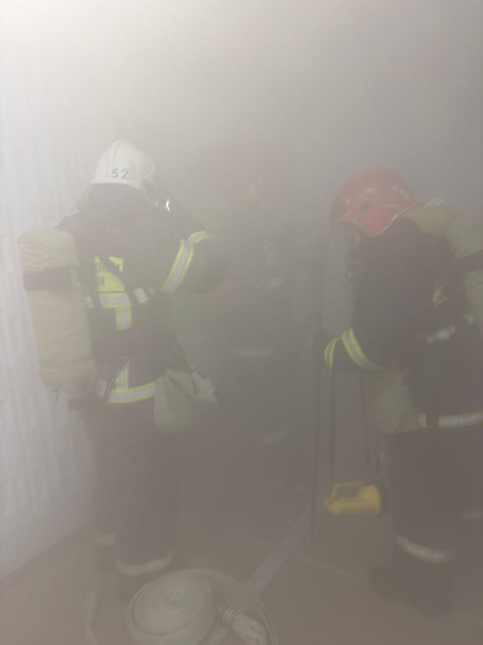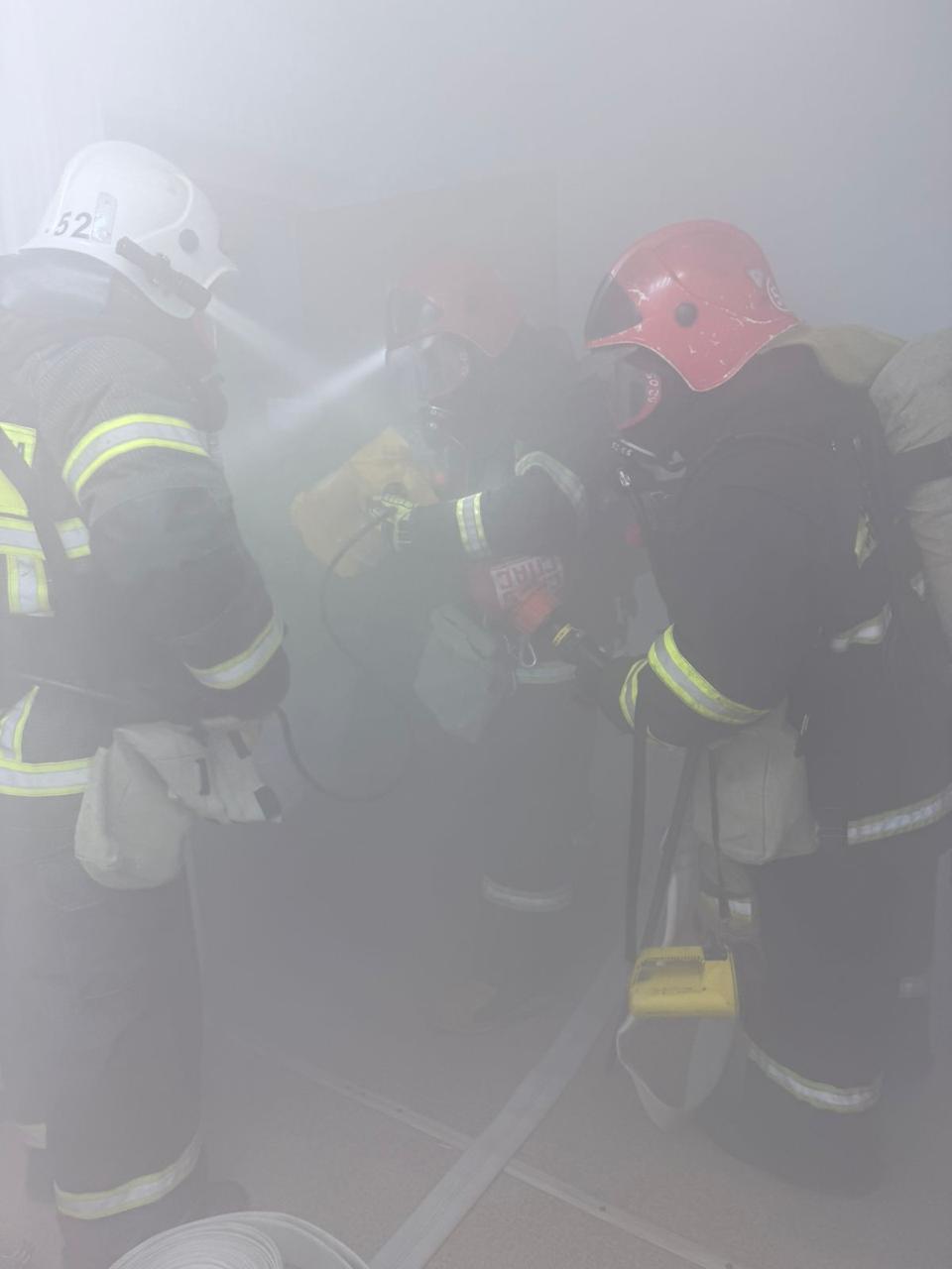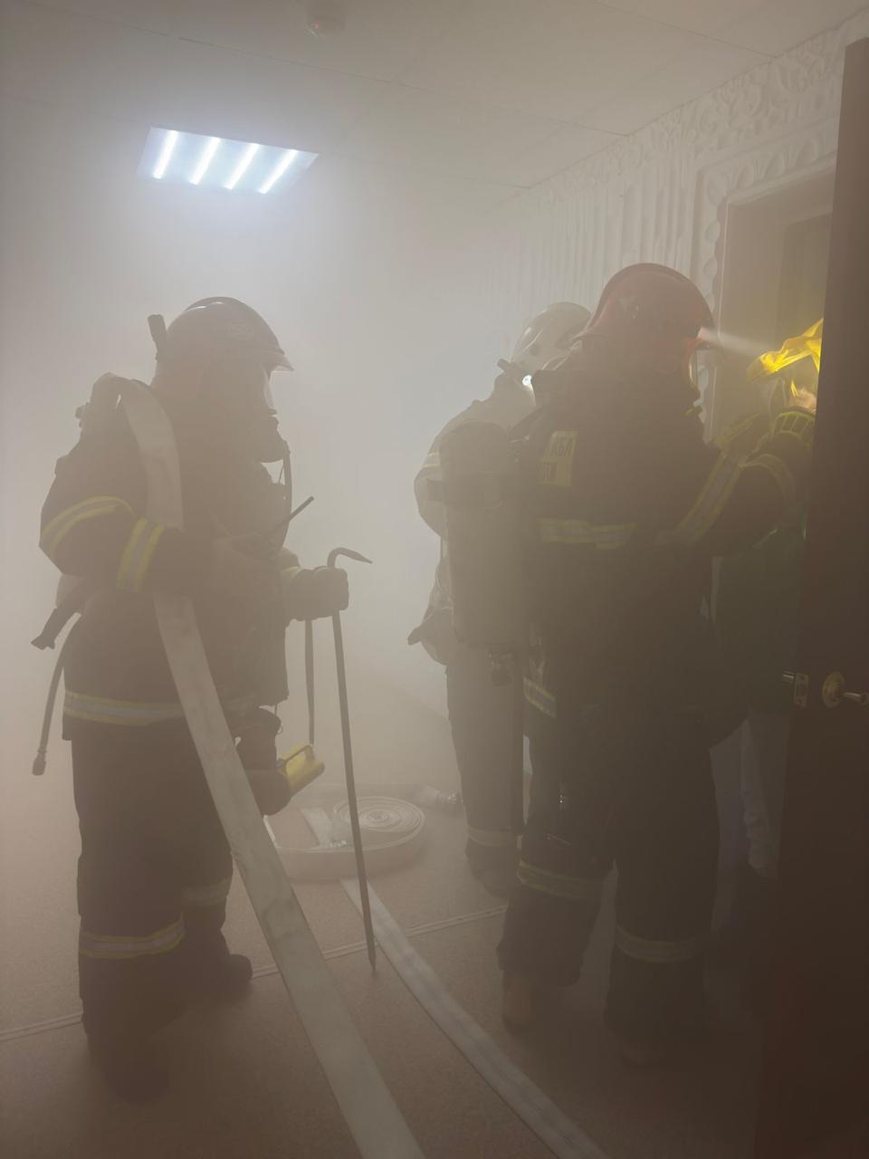 Для создания обстановки, максимально приближенной к реальной, организаторы пожарно-тактических учений использовали искусственное задымление, затрудняя видимость для огнеборцев.