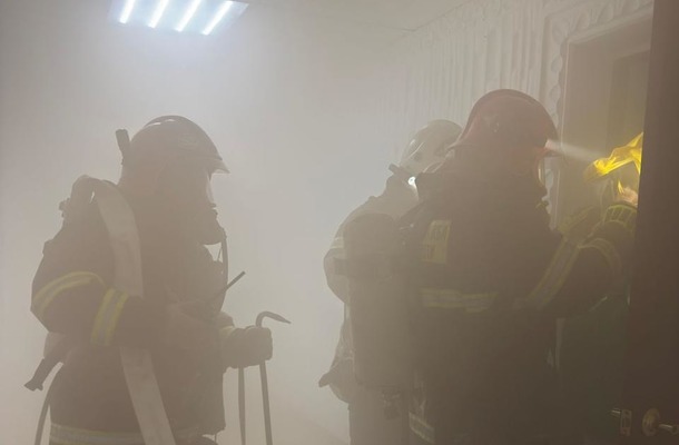 Для создания обстановки, максимально приближенной к реальной, организаторы пожарно-тактических учений использовали искусственное задымление, затрудняя видимость для огнеборцев.
