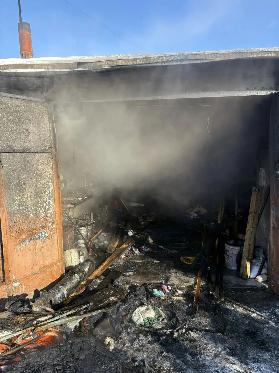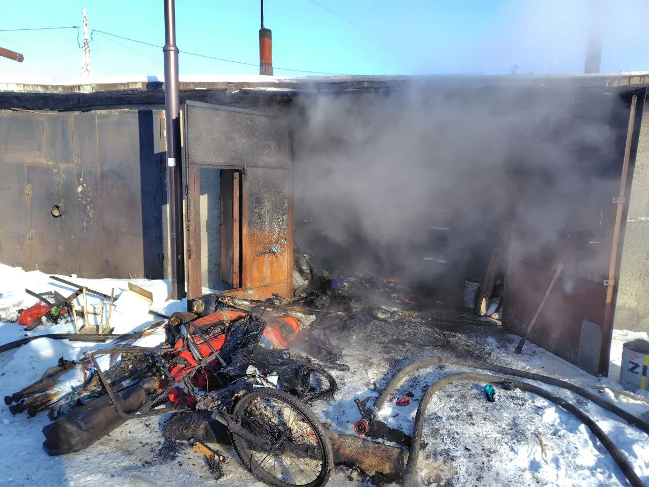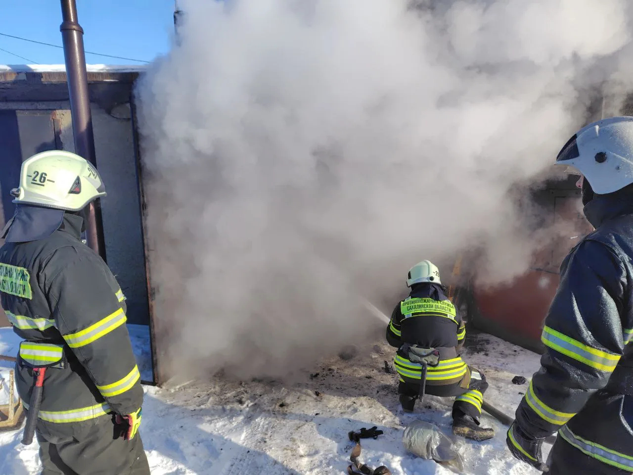 Сообщение о пожаре по адресу: ул. 1-я Речная, 12, поступило в диспетчерскую службу Макаровской пожарно-спасательной части 18 декабря в 12:15. Через 4 минуты пожарные прибыли на место происшествия, где наблюдалось сильное задымление внутри частного гаража.