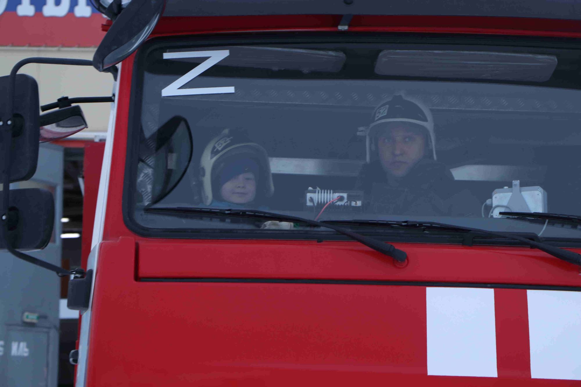 После этого Сергей в каске огнеборца почувствовал себя настоящим пожарным, прокатившись на пожарном автомобиле.