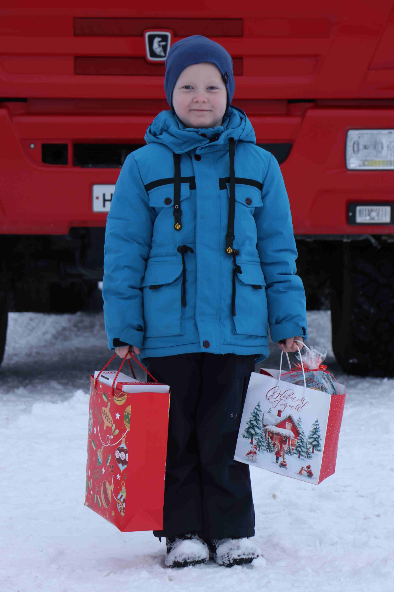 Серёжа получил желаемые подарки: игрушечный пожарный автомобиль и сладости.