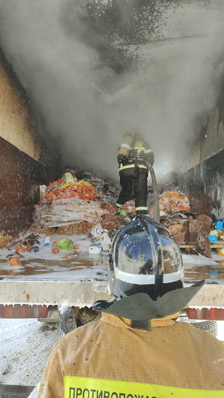 Сообщение о пожаре по адресу: город Долинск, улица Комсомольская, 35, поступило в диспетчерскую службу Долинского пожарно-спасательного отряда 29 января в 12:27. Через четыре минуты пожарные прибыли на место происшествия, где на площади 16 квадратных метров горел кузов торговой фуры. Грузовой отсек транспортного средства был заполнен товарами.