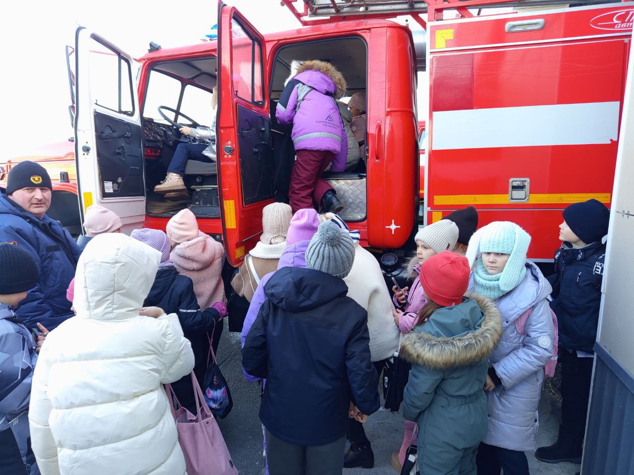 Ребята внимательно слушали рассказы об оборудовании, находящемся в отсеках пожарных автомобилей, чем они оснащены и как используются. С вниманием рассматривали аварийно-спасательные аппараты. Всем желающим дали примерить шлем-каску и боевую одежду пожарного. Особенный восторг у подрастающего поколения , конечно, вызвала возможность посидеть в пожарной машине и, хотя бы на минутку, представить себя в роли пожарного.