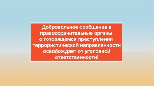 Противодействие терроризму — задача не только спецслужб, но и каждого гражданина. В соответствии с законодательством Российской Федерации, лицо, участвовавшее в подготовке или совершении преступления террористической направленности, освобождается от уголовной ответственности, если оно добровольно и своевременно сообщило о готовящемся преступлении правоохранительным органам, а также способствовало его предотвращению. Эта норма закреплена в примечаниях к статьям 205 (террористический акт), 205.1 (содействие террористической деятельности), 208 (организация незаконного вооруженного формирования), 210 (организация преступного сообщества) и другим статьям Уголовного кодекса РФ.