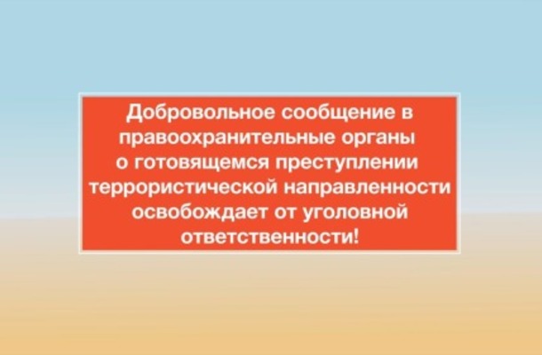 Противодействие терроризму — задача не только спецслужб, но и каждого гражданина. В соответствии с законодательством Российской Федерации, лицо, участвовавшее в подготовке или совершении преступления террористической направленности, освобождается от уголовной ответственности, если оно добровольно и своевременно сообщило о готовящемся преступлении правоохранительным органам, а также способствовало его предотвращению. Эта норма закреплена в примечаниях к статьям 205 (террористический акт), 205.1 (содействие террористической деятельности), 208 (организация незаконного вооруженного формирования), 210 (организация преступного сообщества) и другим статьям Уголовного кодекса РФ.