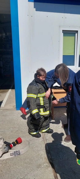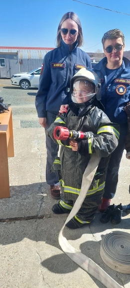 Кульминацией экскурсии стала примерка боевой одежды пожарного. В финале визита маленьким гостям разрешили посидеть за рулём пожарного автомобиля — эта минута запомнится каждому надолго.