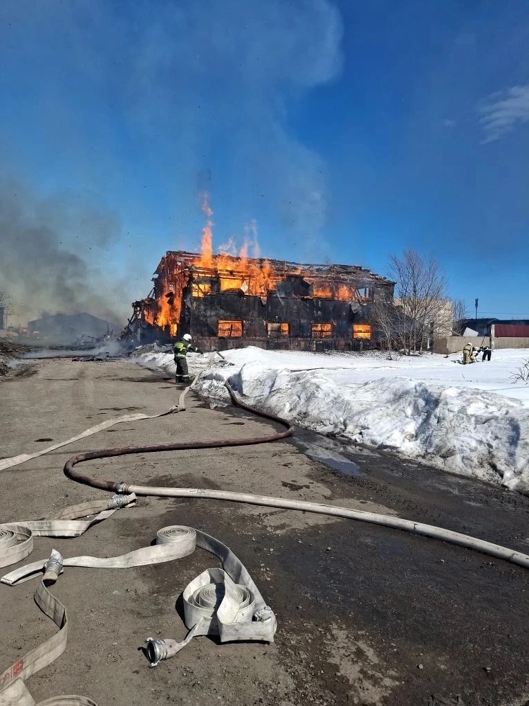 Сообщение о пожаре по адресу: г. Поронайск, ул. Хабаровская, 18, поступило в диспетчерскую службу Поронайского пожарно-спасательного отряда 14 апреля в 15:04. Через 5 минут пожарные прибыли на место происшествия. К этому времени на площади 1385 кв. м открытым пламенем горело неэксплуатируемое здание, пожар сопровождался сильным задымлением. Сильному распространению огня поспособствовало позднее сообщение о пожаре, угроза распространения пламени отсутствовала.