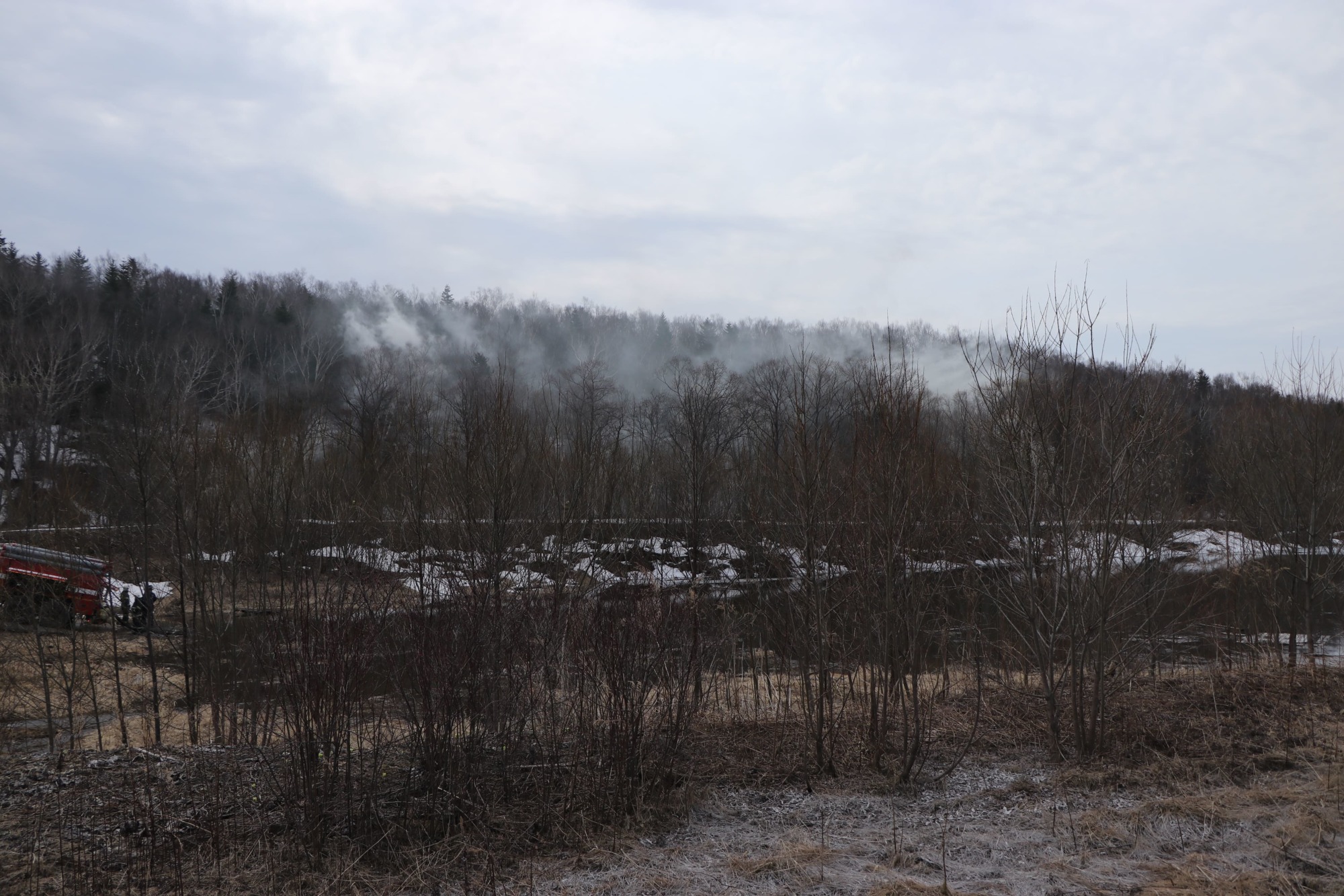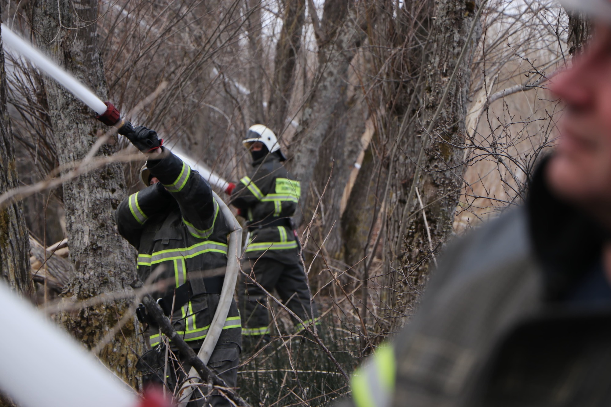 На месте огнеборцы оперативно развернули магистрали из рукавов от озера до места условного тушения пожара, тушили пожар, используя тактику водной завесы. Борцы с огнём подавали распылённые струи воды в сторону леса с помощью ручных пожарных стволов, бронированного перевозного пожарного лафета, а так же лафетного ствола установленного на пожарном автомобиле.