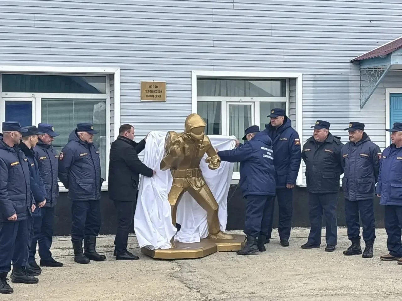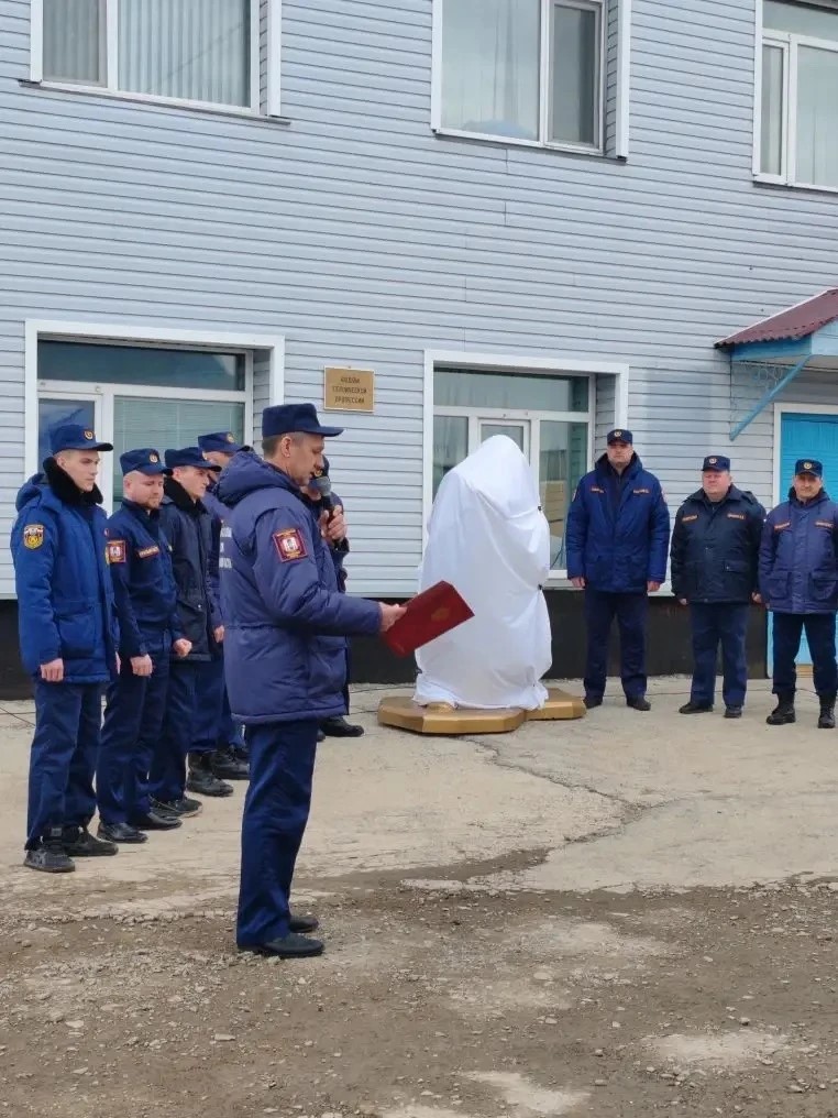 Право открыть скульптуру получили старожил пожарной охраны, начальник караула ПСЧ № 43 с.Молодёжное Владимир Чиганашин, и первый заместитель руководителя ОКУ «Пожарно-спасательная служба Сахалинской области» Виталий Сотников.